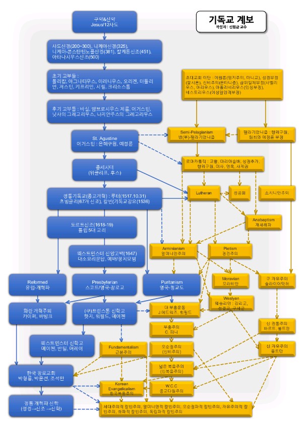 신원균 교수가 만든 신학 계통도 이다. 좋은 시도라고 생각한다. 신학계통이 끊이지 않게 유지하여, 역사적 기독교 체계를 구성했다. 루터파를 주황색으로 분류시킨 것은~~ 로마 카톨릭과 화해 협약을 하긴했다. 한국 장로교회가 네덜란드 개혁파와 웨스트민스터(구 프리스턴) 전통을 잇게 된 공로는 박형룡 박사의 역할이라로 필자는 평가하고 있다.