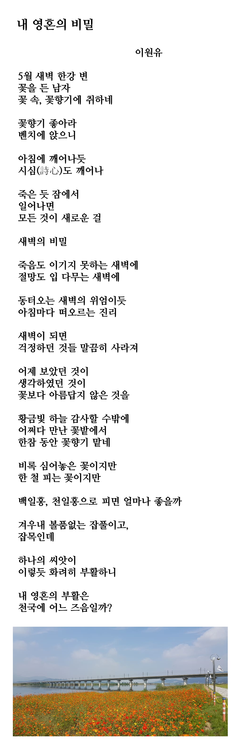 이전 기사보기 다음 기사보기 【신앙시】 내 영혼의 비밀 스크롤 이동 상태바 현재위치 문화 【신앙시】 내 영혼의 비밀 입력 2020.05.04 17:27 글자 크기 본문 글씨 키우기 본문 글씨 줄이기 프린트 인쇄하기 SNS 기사보내기 기사저장 다른 공유 찾기 이 기사를 공유합니다 닫기 저작권자 © 본헤럴드 무단전재 및 재배포 금지 관련기사 【이원유 에세이】 우수(雨水)에 봄눈 【이원유 에세이】 사랑이 남기고 가는 것 본헤럴드 webmaster@bonhd.net 다른기사 보기 개의 댓글 회원로그인 작성자 비밀번호 댓글 내용입력 댓글 정렬 최신순 추천순 답글순 BEST댓글 BEST 댓글 답글과 추천수를 합산하여 자동으로 노출됩니다. 닫기 더보기 댓글삭제 삭제한 댓글은 다시 복구할 수 없습니다. 그래도 삭제하시겠습니까? 비밀번호 댓글수정 댓글 수정은 작성 후 1분내에만 가능합니다. 본문 / 400 비밀번호 내 댓글 모음 닫기
