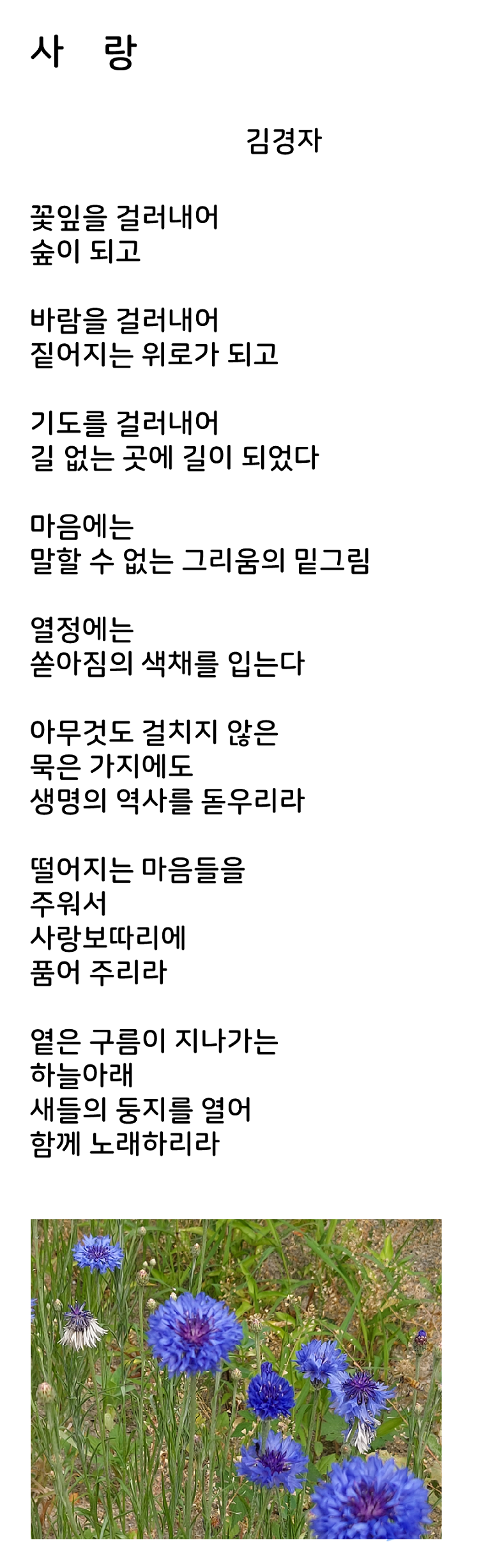 이전 기사보기 다음 기사보기 【김경자 목사】 Psalms 151, 『사랑』 스크롤 이동 상태바 현재위치 문화 【김경자 목사】 Psalms 151, 『사랑』 입력 2020.06.11 16:35 수정 2020.06.11 17:42 글자 크기 본문 글씨 키우기 본문 글씨 줄이기 프린트 인쇄하기 SNS 기사보내기 기사저장 다른 공유 찾기 이 기사를 공유합니다 닫기 저작권자 © 본헤럴드 무단전재 및 재배포 금지 관련기사 【김경자 목사】 Psalms 151 -기도 [김경자목사' 기도 시] 봄의 소망 【김경자 목사】 Psalms 151, 『아픈 시간』, 『소망』 【김경자목사】Psalms 151, 새해의 기도 삼겹줄은 쉽게 끊어지지 않습니다 l 10회ㅣ 최원영목사의 5분백신 l 본푸른교회 l 2020-06-11 "거룩함 하나님의 성품인 것을 아십니까?" l 11회 l 코로나 5분 백신 l 최원영목사 [12회]정직, 하나님이 쓰시는 리더는 누구인가? 【김경자 목사】 Psalms 151, 『소망』 【김경자 목사】 Psalms 151, 『숲속의 위로』 【김경자 목사】 Psalms 151, 『구월의 기도』 본헤럴드 webmaster@bonhd.net 다른기사 보기 개의 댓글 회원로그인 작성자 비밀번호 댓글 내용입력 댓글 정렬 최신순 추천순 답글순 BEST댓글 BEST 댓글 답글과 추천수를 합산하여 자동으로 노출됩니다. 닫기 더보기 댓글삭제 삭제한 댓글은 다시 복구할 수 없습니다. 그래도 삭제하시겠습니까? 비밀번호 댓글수정 댓글 수정은 작성 후 1분내에만 가능합니다. 본문 / 400 비밀번호 내 댓글 모음 닫기