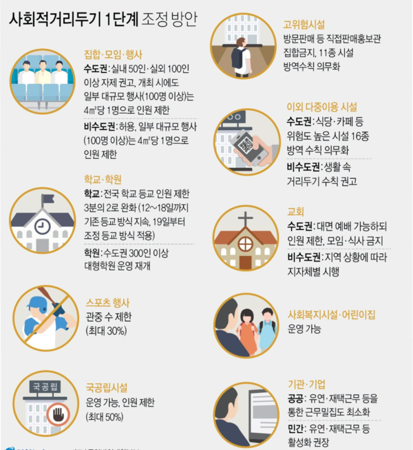 식사제공은 여전히 금지된다. 수도권 이외 지역은 지방자치단체 재량에 맡기기로 했다. 대신 생활속 거리두기 수준인 사회적 거리두기 1단계에서도 마스크 착용, 출입자 명부 관리, 거리 두기 등 기본적인 수칙은 지키도록 권고한다고 했다.