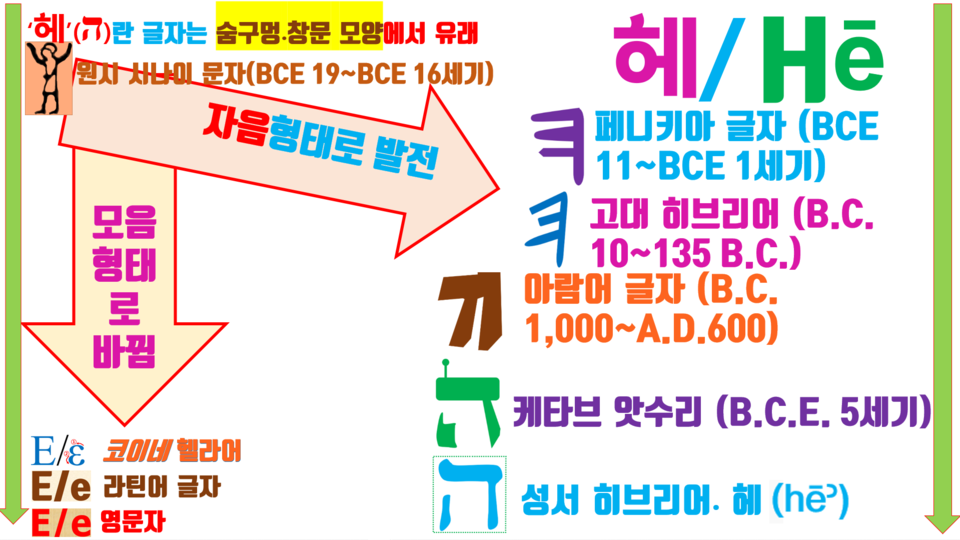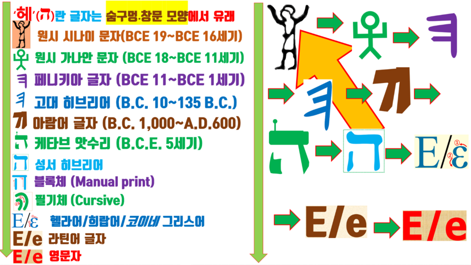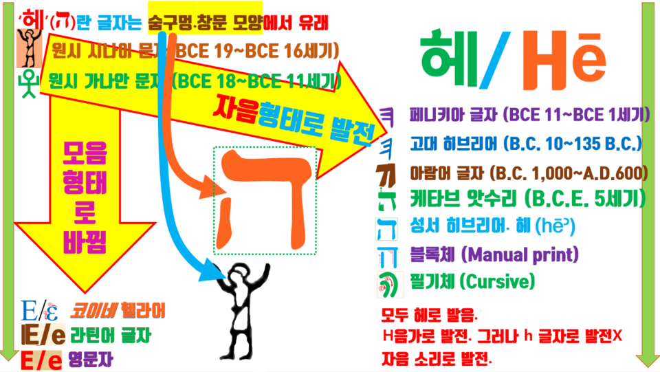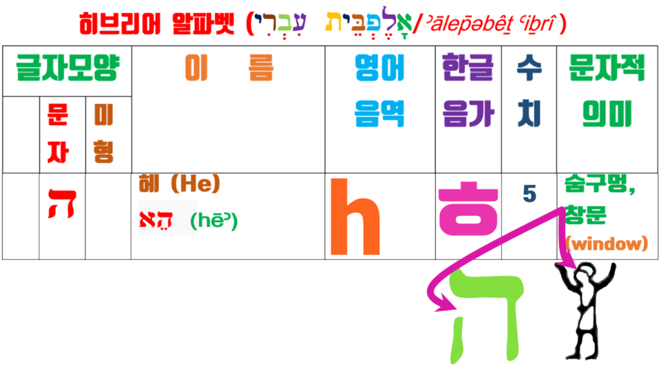 ▶원시 가나안 문자가 페니키아, 고대 히브리어, 케타브 앗수리, 현대 히브리어에서는 헤(ה)란 발음의 h 음가로 발전했다.