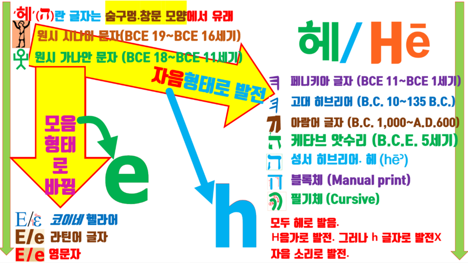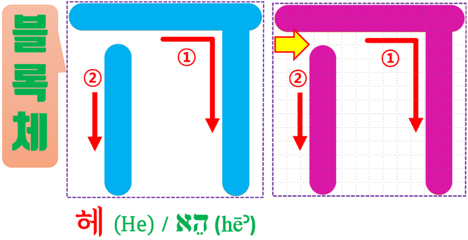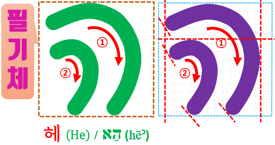 ▶히브리어 헤(ה)란 글자는 페니키아 시대부터 성서 히브리어 사용 시기까지 모두 헤(Hē)라고 읽었다.
