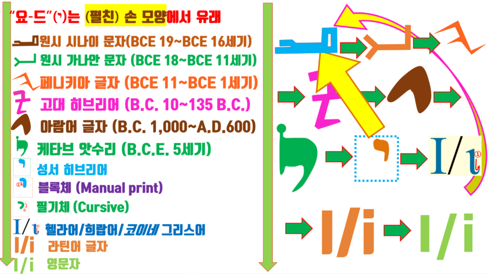 ▶성서 히브리어 10번째 글자 요드 (י)를 원시 시나이시대까지 추적해 보면, 펼친 손 모양을 그림문자로 사용한 것에서 유래했다.