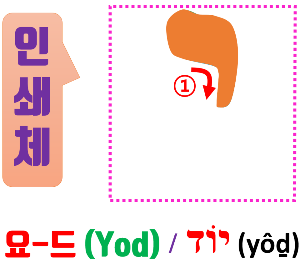 ▶붉은색 글자는 성서 히브리어 인쇄체 열 번째 글자 요드 (י)이다.