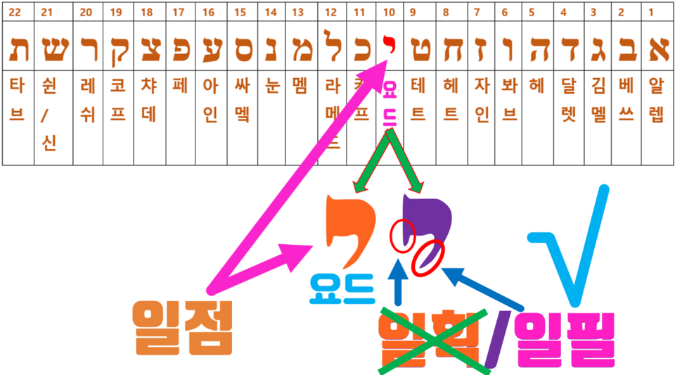 ▶예수님이 일점일획이라고 언급한 그 “일 점”이 바로 10번째 글자 요드 (י)이다.