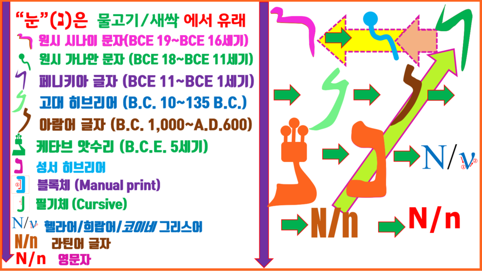 ▶라틴어 엔(N)과 로마자 N도 페니키아 눈(נ)이란 글자의 영향을 받았다.