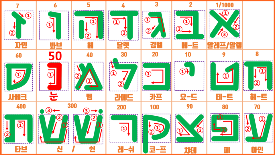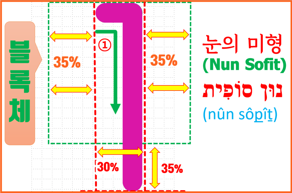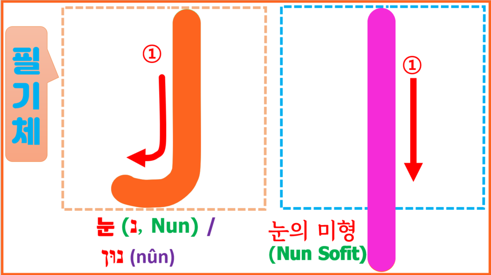 ▶눈(נ)의 꼬리형 블록체 쓰는 순서이다.