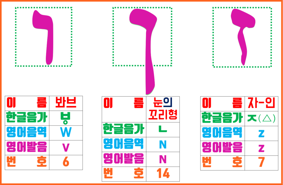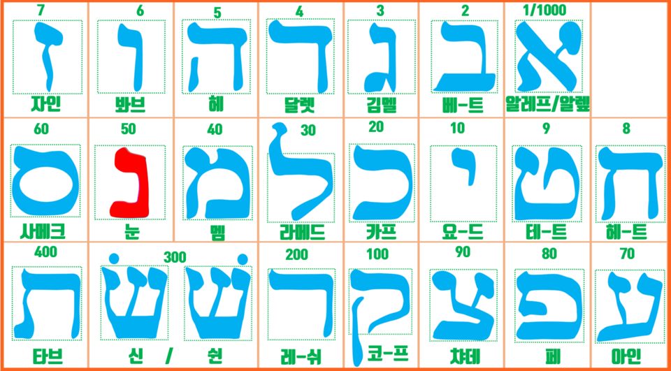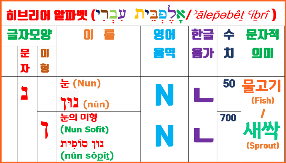 ▶눈(נ)이란 글자는 물고기 또는 새싹을 그림문자로 사용하던 것에서 유래했다.