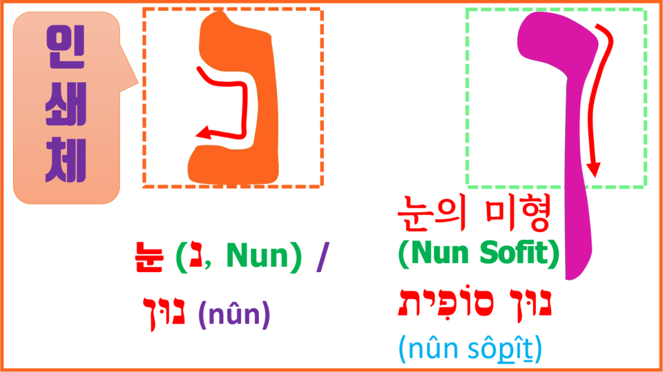 ▶오른쪽 글자는 눈(נ)의 꼬리형 인쇄체이다.