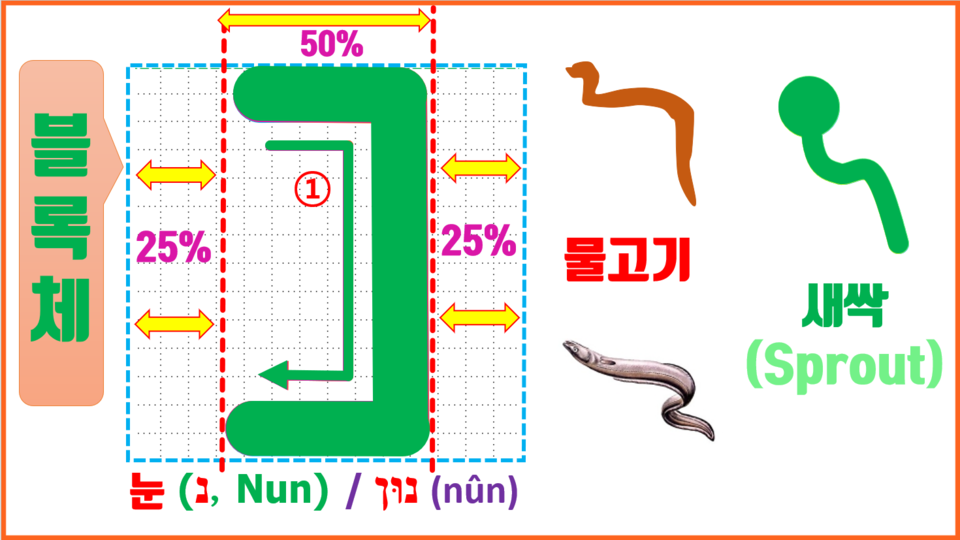 ▶눈(נ)이란 글자는 물고기와 새싹을 상징하는 표시의 그림문자로 발전했다.