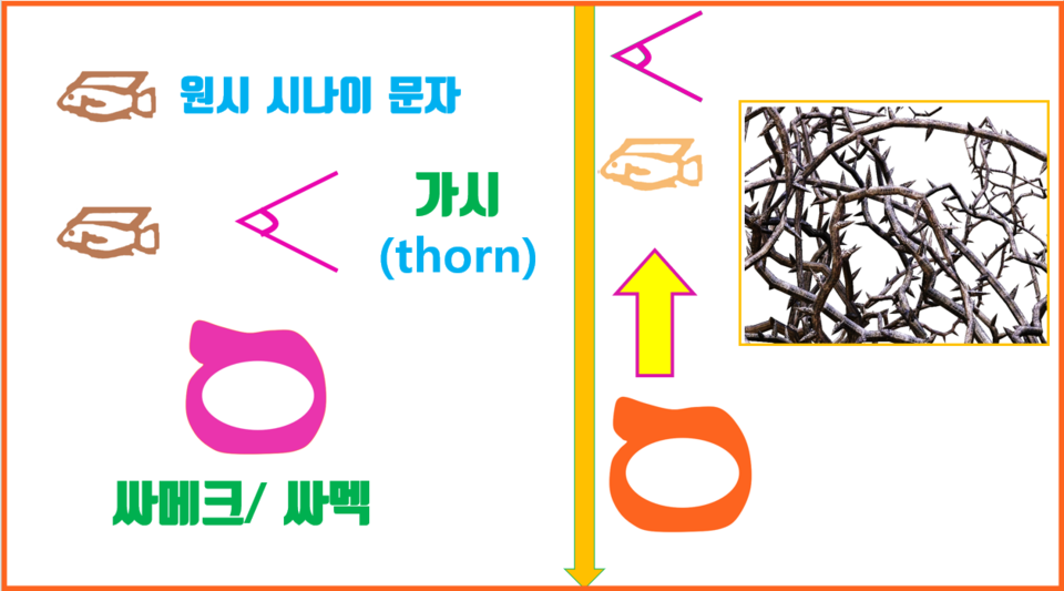 ▶1) 원시 시나이 유래설의 근거는 원시 시나이 시대 때 물고기의 가시(thorn)를 상징하는 그림문자를 사용하던 것에서 찾는다.