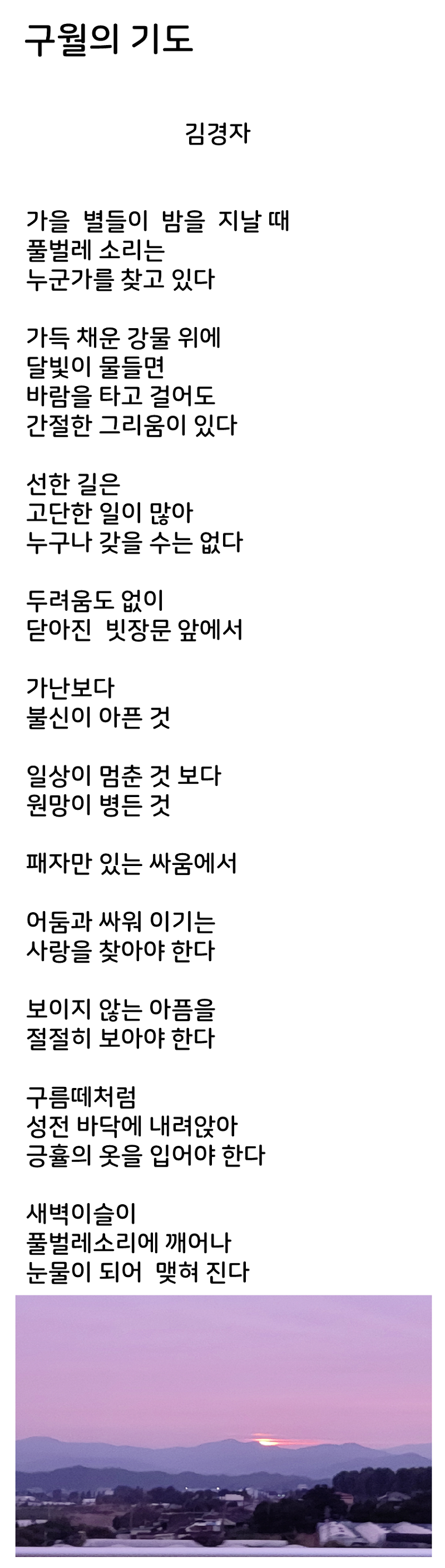 관련기사 【김경자 목사】 Psalms 151, 『숲속의 위로』 【김경자 목사】 Psalms 151, 『여름 풍경』 【김경자 목사】 Psalms 151, 『소망』 【김경자 목사】 Psalms 151, 『사랑』 【김경자 목사】 Psalms 151 -기도 【광야의 기도】 “역사(驛舍)에 울린 한밤중의 찬송이 나를 살려” [발행인 최원영 칼럼]영적 독서 “렉치오 디비나”(lectio divima) 【김경자 목사】 Psalms 151, 『가을 편지』