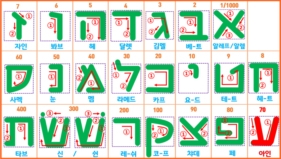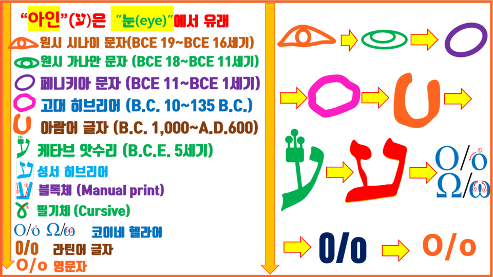 ▶히브리어 아인(ע)은 코이네 헬라어 오미크론(Ο/ο)과 오메가(Ω/ω)로 발전했다.