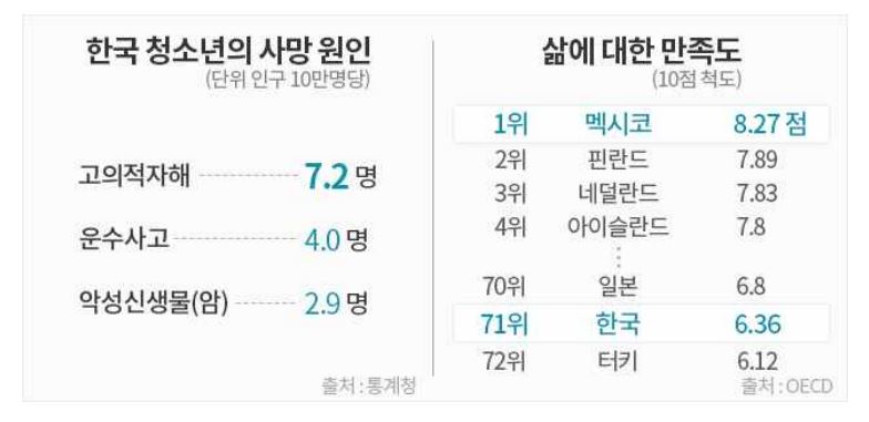 자살의 문제는 연령을 뛰어넘어 누구에게나 마음 아픈 일입니다만 특히 청소년의 자살은 가족뿐 아니라 듣는 이 모두에게 충격과 상처가 됩니다. 우리나라 청소년은 어른이 되기도 전에 세상 살기가 참 힘듭니다. 2018년 우리나라 청소년의 사망 원인 1위는 2018년 현재, 9년째 '자살'입니다. 성적 스트레스에 따른 우울증과 싸우는 청소년이 4명 중 1명꼴이고, 하루 평균 1.5명의 청소년이 성적 때문에 스스로 세상을 등지고 있습니다. 한국 청소년들은 고의적 자해 즉 자살이 교통사고나 암보다 적어도 두 배 가량은 높습니다. 삶의 만족도 역시 전 세계에서 71위로 나타납니다. 이는 조사대상 72개국 가운데 터키를 제외하고 가장 낮은 수치입니다.