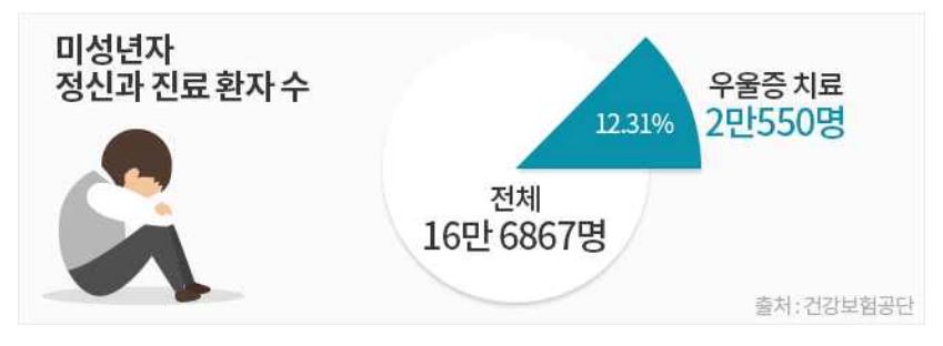 청소년들이 자살을 결심하게 되는 이유 중 가장 흔한 이유는 우울증입니다. 건강보험공단에 따르면 전국의 미성년자 정신과 진료 환자 수는 16만6867명(2015년 기준)이었습니다. 이 중 우울증으로 치료를 받은 학생은 2만50명이었다고 보고합니다. 서울시에서는 미성년자 우울증 환자의 38%가 학원이 밀집한 5개 구(區)에서 진료받은 것으로 나타났습니다. 미성년자 정신과 진료환자 가운데 약 12.3%가 우울증 치료를 받은 것으로 보고되고 있습니다.