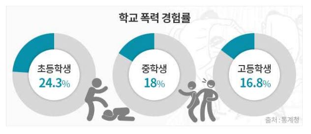 학교 폭력도 청소년을 힘들게 하는 요소 중 하나입니다. 통계청의 '한국의 사회 동향 2016'에 따르면 2015년 기준으로 학교 폭력 경험률은 초등학생이 24.3%로 중학생(18%), 고등학생(16.8%)보다 높았습니다. 조사에 따르면 초등학생부터 고등학생에 이르기 까지 약 20%의 학생들이 학교폭력의 경험이 있습니다.