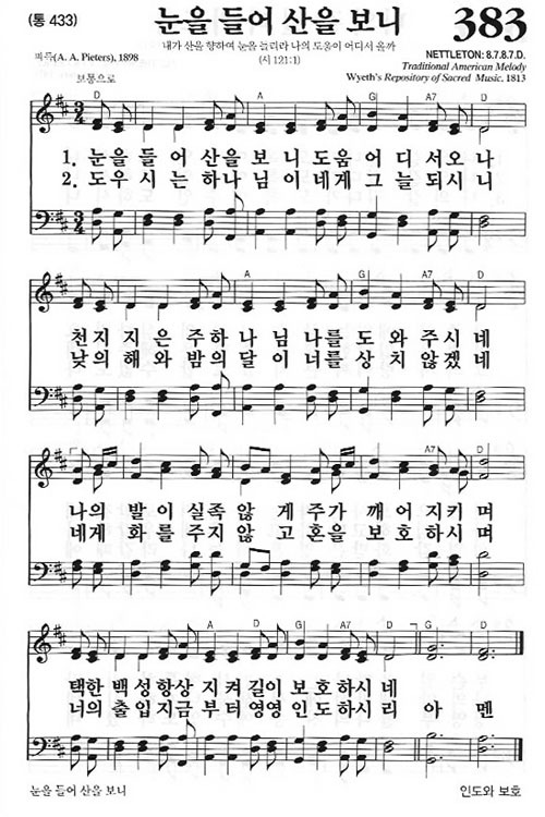 1절 "눈을 들어 산을 보니 도움 어디서 오나 천지 지은 주 하나님 나를 도와주시네 나의 발이 실족 않게 주가 깨어 지키며 택한 백성 항상 지켜 길이 보호 하시네"
