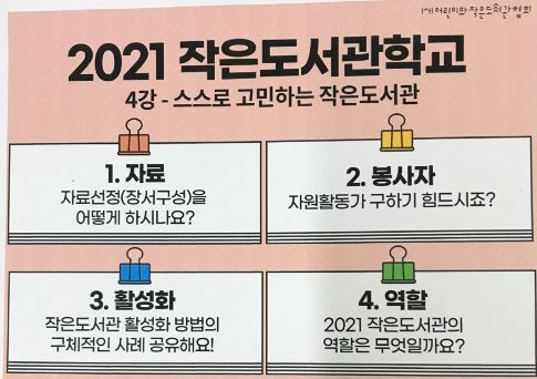 첫번째 협력멘토링 주제는 "스스로 고민하는 작은 도서관"에 관한 공동 토론이었다. (1)자료 : 자료선정(장서구성)을 어떻게 하시나요?(2)봉사자 : 자원 활동가 구하기 힘드시죠? (3)활성화 : 작은 도서관 활성화 방법의 구체적인 사례 공유해요. (4)역할 : 2021 작은 도서관의 역할은 무엇일까요?