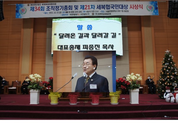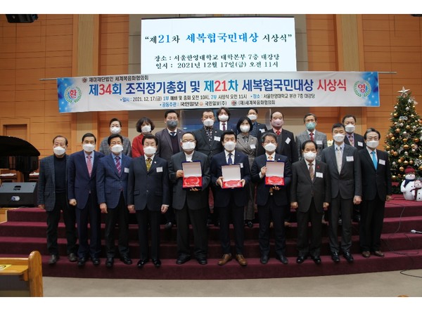 17일(금) 서울한영대학교 7층 대강당에서 세계복음화협의회(이하 세복협) 제34회 정기총회를 개최하였고, 총회 후에 제21차 세복협국민대상 시상식을 진행했다. 행사는 코로나19 정부 방역수칙에 의해 방역패스를 적용하여 방역패스 조건에 맞춰 참석 및 순서를 진행했다.