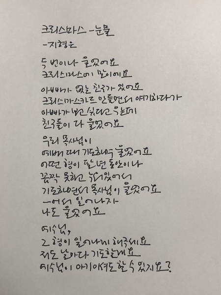 지형은 목사는 지방회 목사님들의 감사 글 뒤에 “서울제일지방회의 모든 목회자 내외분들과 자녀 후손들이 크리스마스에 행복하시길 기도합니다~^^”라는 메시지와 함께, “크리스마스-눈물”이란 시를 캘리그라피로 직접 써서 올렸다.