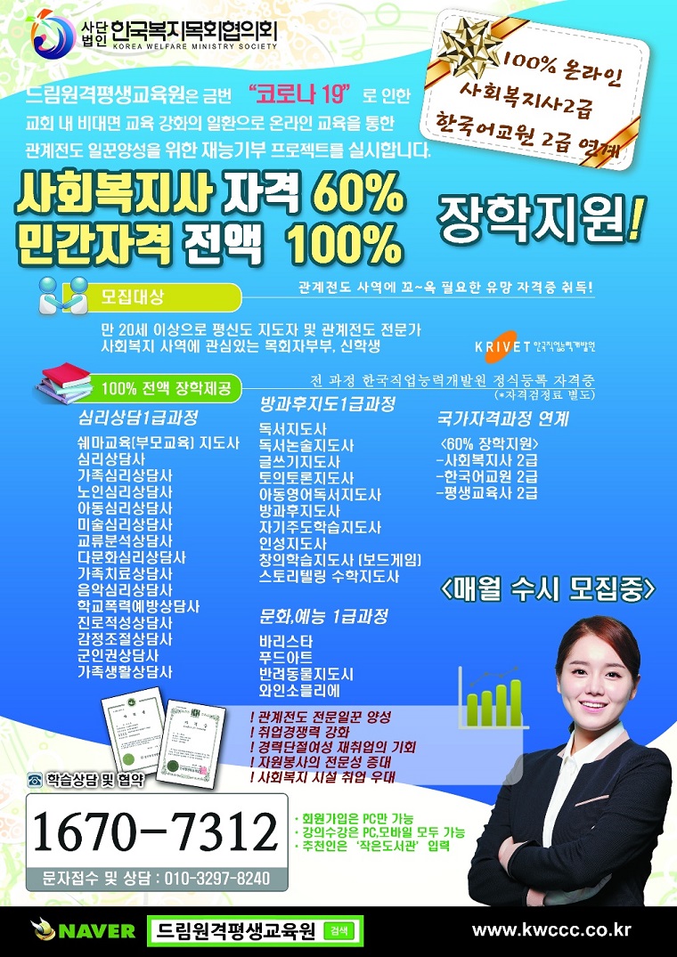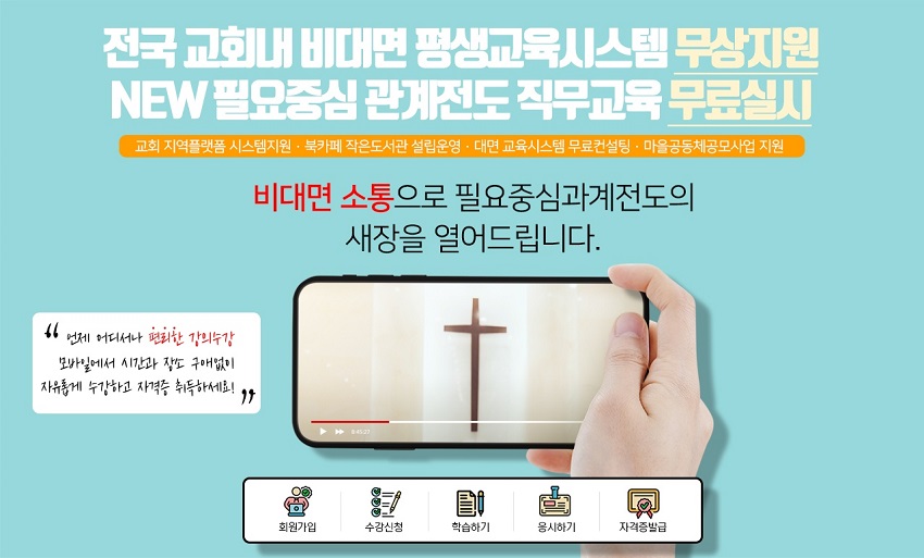 드림원격평생교육원 (www.kwccc.co.kr) 은 교회의 추천으로 누구나 회원가입하고 전액장학으로 수강할수 있기에 다음세대를 세우고,지역과 소통하는 역동적인 교회들에게 특별한 소통, 참여, 공감의 지역거점 플랫폼 발전할수 있다고 강조했다.