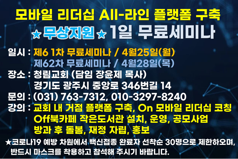 이번 세미나에서는 교회 내 ALL LINE 거점플랫폼 구축으로 다음세대 주중교육과 지역사회와의 적극적인 소통으로 교회가 지역사회의 중심이 되어 건강한 영향력을 미치는 역할을 감당할 수 있도록 행정절차와 프로그램 지원, 운영방안 등 전반적인 내용을 공유한다. 또한 장윤제 목사가 시무하는 청림교회 운영 북카페 작은도서관의 성공 노하우, 북카페 작은도서관 설립에서부터 운영 노하우, 관련 리더쉽코칭 무상교육 과정까지 공개한다.