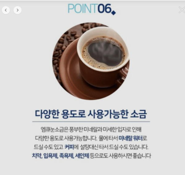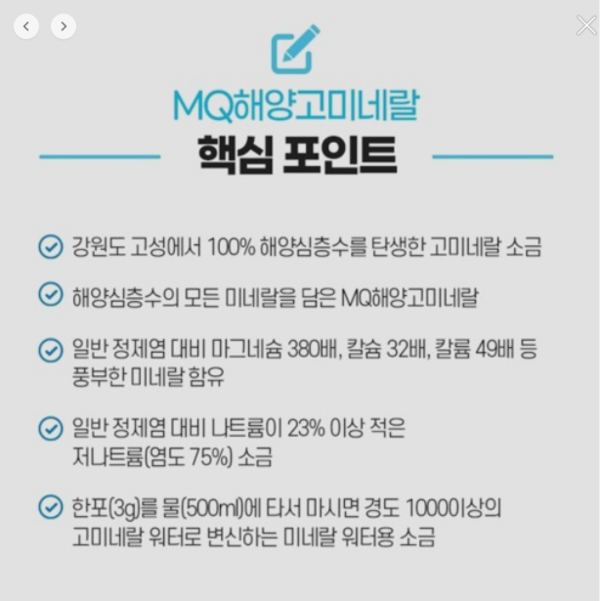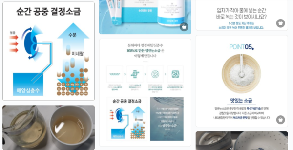 또 새로운 점은 소금을 산 고객분들이 소금을 음식 간하기 위해 사용하기도 하지만, 상당수는 미네랄 워터 제조를 통한 미네랄 보충용으로 마시고 있다는 것이다. ★소금을 500mL 3g 정도 타면 바로 물이 우윳빛으로 바뀌고 2~3분 내로 완전 이온화되어 투명해진다. 마시면 포카리스웨트 맛이 나는 맛있는 미네랄 워터로 바뀐다.