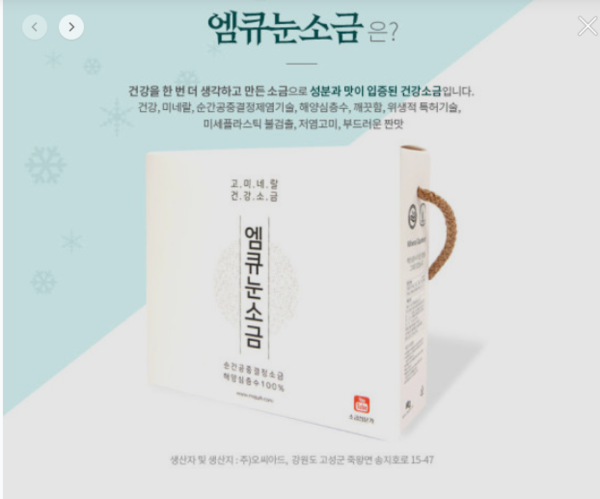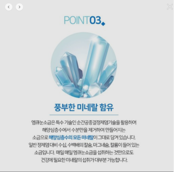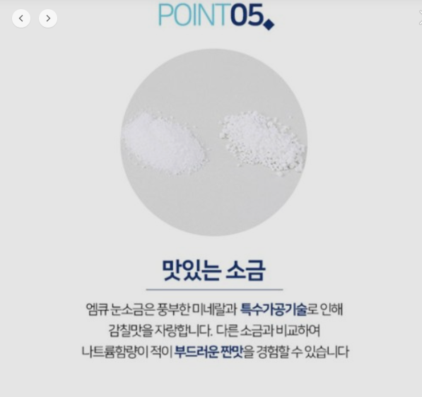 소금 섭취의 패러다임을 바꾼 제품이라고 할 수 있다. 75% 수준의 낮은 염도, 칼슘, 칼륨 마그네슘은 일반정제염 대비 수십 수백배가 많은 깨끗한 미네랄 소금으로 널리 알려지고 있다.