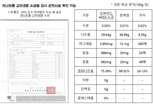 기존 천일염은 농축과정에서 칼슘 등의 미네랄을 제거하고 간수 제거 공정에서 마그네슘 등의 미네랄을 제거하는 것과는 달리, 해양심층수 미네랄 눈소금은 86가지 정도의 다양한 미네랄을 포함한 미네랄 덩어리인 것이다.