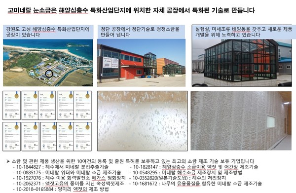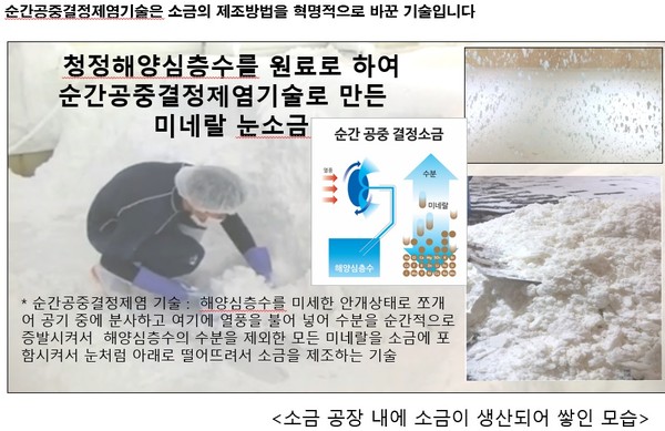 소금을 제조하는 방법도 기존 소금 제조 방법과 완전하게 다르다. 청정해양심층수를 RO막을 이용하여 1차 농축한 후 한국해양과학기술원과 공동으로 개발한 순간공중결정제염기술을 이용하여 공중에서 순간적으로 소금과 물을 분리하여 눈처럼 내려 쌓이게 하는 원리로 소금을 제조한다. 미네랄 풍부한 해양심층수에서 수분만을 제거, 모든 미네랄을 소금에 100% 포함되도록 하는 방식으로 소금을 제조한다.