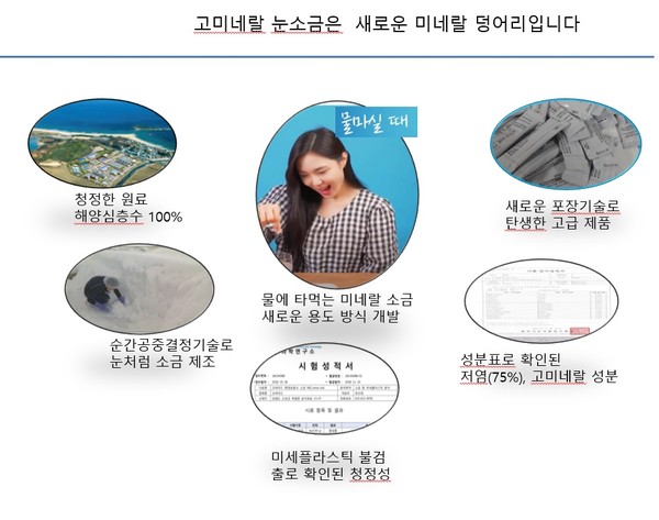 이렇게 만들어진 미네랄 눈소금은 원래 이온화되었던 미네랄이고 입자 또한 나노입자 수준이어서 물에 바로 녹고 이온화가 쉽게 되어 흡수율 또한 높다. 깨끗함에 완벽을 기해 미세플라스틱 불검출 확인(100 마이크로 기준)을 받았다.