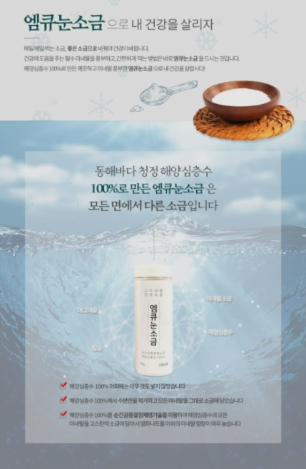 깨끗한 해양심층수를 초정밀 필터로 한 번 더 거른 후 ●순간공중결정제염기술로 순간적으로 수분만을 제거하여 눈처럼 모든 ●미네랄이 내려 쌓이게 하는 기술로 미네랄 눈소금을 제조하여 바다의 모든 미네랄을 고스란히 자연 그대로 담은 미네랄 눈소금 섭취가 유용하다. 500ml 생수병에 티스푼(3g)의 미네랄 눈소금을 넣어 아침과 저녁으로 한 병씩 먹어 86가지 정도의 순수 미네랄을 섭취하면 건강에 좋을 것이다.