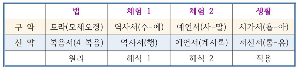 수직적 성경 읽기는 성경의 구조를 보면 이해가 된다. 구약은 율법서, 역사서, 시가서, 예언서로 되어 있다. 신약은 복음서, 역사서, 서신서, 예언서이다. 구약이나 신약 모두 같은 구조로 되어 있다.