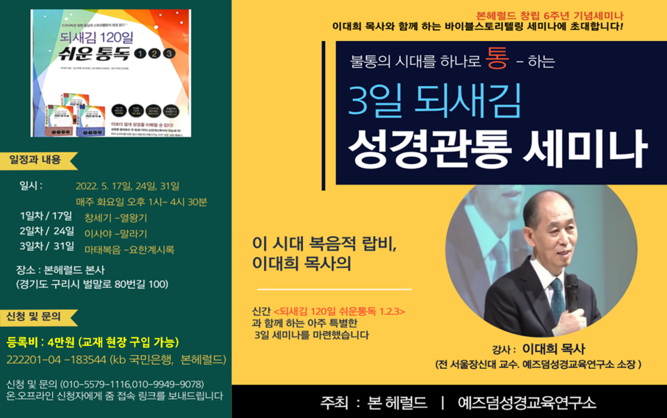 본헤럴드는 지난 30년간 오로지 성경교육에만 매진한 이대희 목사를 초청해 『3일 되새김 성경통독 학교』 성경관통세미나를 진행하고 있다. 3차에 걸친 세미나에서 이대희 목사의 세미나 내용을 시간의 흐름에 따라 핵심을 소개해본다.