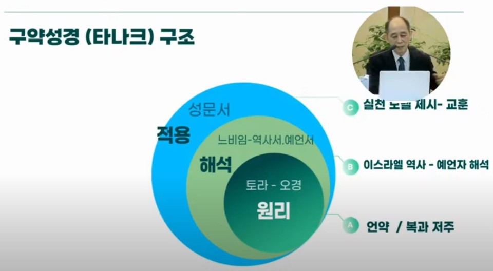 그렇다면 성경을 어떻게 읽어야 하나? 그 구조를 이해하면서 봐야 한다. 구약성경(크나크) 구조는 ‘토라’라고 불리는 모세오경은 핵심 원리이고, 그것을 감싸는 것이 ‘느비임’은 역사서와 예언서로서 해석이며, 시편과 같은 성문서는 삶에 적용한 것이라 할 수 있다. 성경을 일반 서적 읽듯이 쭉 읽어 가면 안 된다. 원리-해석-적용의 관점에서 성경을 읽어야 한다. 예수님이 구약에서 가장 많이 인용한 말씀이 시편인 것을 보면 예수님도 하나님 말씀을 적용하며 살아간 삶의 고백을 중요하게 여기신 것으로 알 수 있다.
