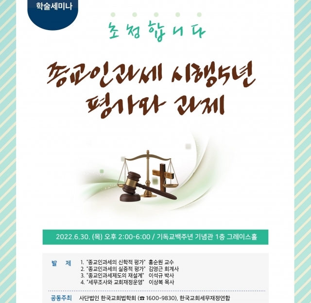사단법인 한국교회법학회(이사장 소강석 목사, 학회장 서헌제 교수, 상임이사 황영복목사)와 한국교회세무재정연합(공동대표 김영근 회계사, 이상복 목사)는 오는 6월 30일(목) 오후 2시~6시까지 서울 종로구 한국교회100주년기념관에서 『종교인 과세 시행 5년 평가와 과제』 공동학술세미나를 열 계획이다. 이 세미나는 지난 5년간의 종교인과세에 대한 평가를 하고 이를 신학적으로 이해할 뿐만 아니라 재정비하는 취지로 준비됐다.