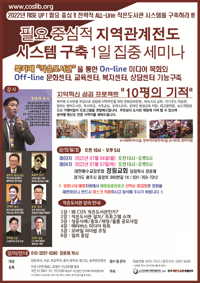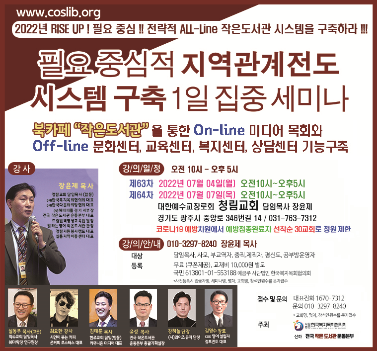 이번 세미나는 북카페 작은도서관을 통한 온라인 미디어목회와 오프라인 문화센터, 교육센터, 복지센터, 상담센터 구축을 이룰 수 있는 쉽고 분명한 노하우가 전수될 예정이다.