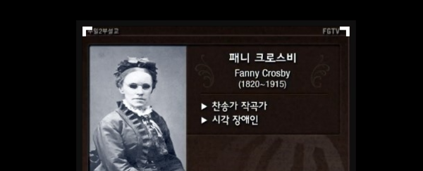 1820년 3월 24일 미국 뉴욕주의 조그마한 마을에서 <패니 크로스비(Fanny Crosby)>라는 여자 아이가 태어났습니다. 그런데 생후 1개월 정도 되었을 때였습니다. 감기에 걸려 열이 오르면서 눈병이 생기게 되었는데, 그 집에서 가정부로 일하던 사람이 애기 눈에 약을 발라준다는 것이 엉뚱한 약을 발라, 그만 장님이 되어버리고 말았습니다. 그 후 1년도 채 못되어 그녀의 아버지가 세상을 떠났습니다.
