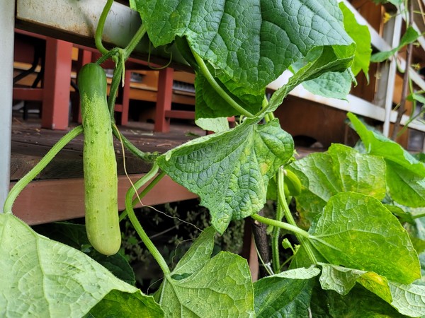오늘 아침은 이런 세상사와 날씨가 주는 불쾌지수를 한방에 씻어낸다. 교회 마당에 작은 텃밭을 운영하고 있다. 텃밭의 기능보다는 정원의 역할이 더 맞을 듯싶다. 고추를 보니 아주 싱싱하게 열매가 주렁주렁 열려있다. 2주전만 해도 성장 속도나 열매가 그리 만족스럽지 않았다. 그 옆에 있는 가지도 줄기와 잎이 힘이 있어 보인다. 벤치에 의지하여 자라고 있는 오이도 싱싱하다.