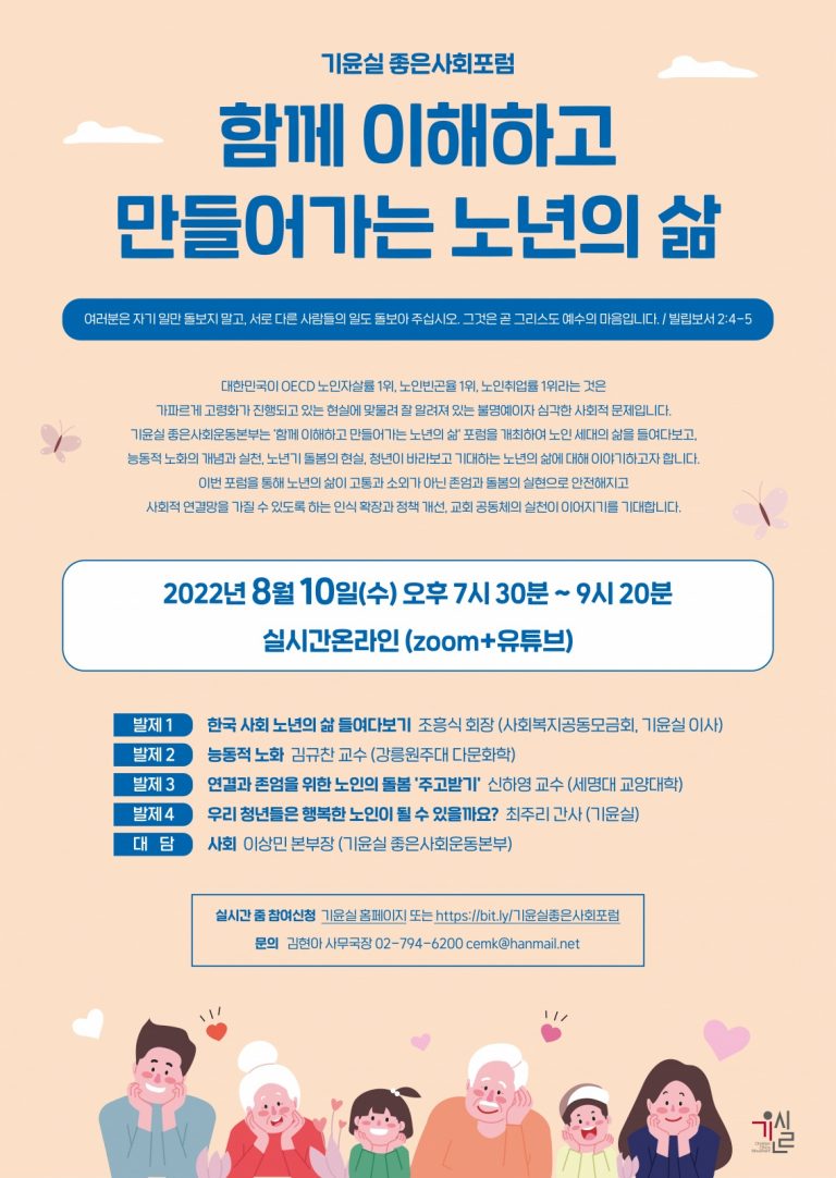 대한민국이 OECD 노인자살률 1위, 노인빈곤율 1위, 노인취업률 1위라는 것은 가파르게 고령화가 진행되고 있는 현실에 맞물려 잘 알려져 있는 불명예이자 심각한 사회적 문제이다. 기윤실 좋은사회운동본부는 ‘함께 이해하고 만들어 가는 노년의 삶” 포럼을 개최하여 ‘노인 세대’의 삶을 들여다보고, 능동적 노화의 개념과 실천, 노년기 돌봄의 현실, 청년이 바라보고 기대하는 노년의 삶에 대해 이야기하고자 한다.