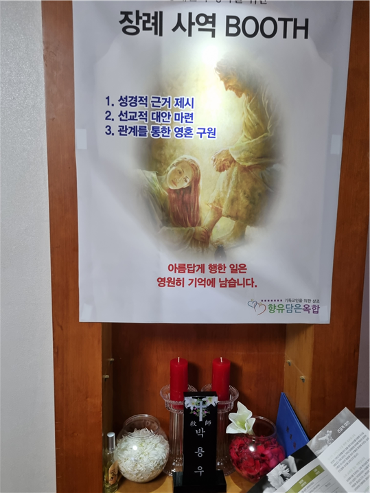 성경은 지혜자의 마음이 초상집에 있다고 하였다. 그 이유는 모든 사람의 끝이 이와 같이 됨을 마음에 두고 그로 인해 얼굴에 근심하는 것이 마음에 유익하기 때문이라고 하였다. 장례식장은 인생의 가장 큰 숙제를 던져주는 장소로 이에 대한 해답을 가르쳐준다면 한 영혼을 구원하는데 가장 좋은 장소라 할 수 있을 것이다.