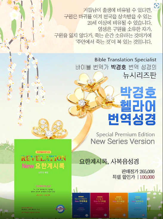 히브리어&헬라어 번역 출판사에서 박경호 원장이 20여년이 넘게 순수번역 순수진리 탐구만을 목적으로 끈질긴 노력과 연구 끝에 완전직역에 성공한 박경호헬라어번역성경 NEW시리즈 4복음서와 요한계시록에 이어 로마서까지 출판이 되어 목회자와 일반인들에게도 주목을 받고 있습니다.