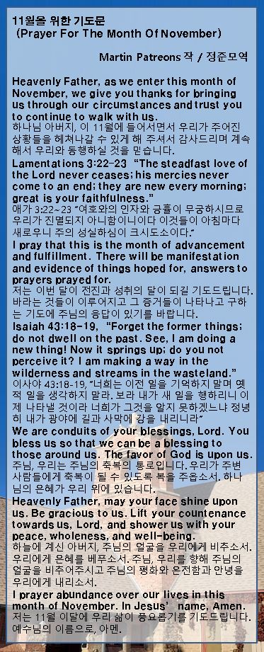 저는 11월 이달에 우리 삶이 풍요롭기를 기도드립니다. 예수님의 이름으로, 아멘.