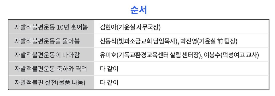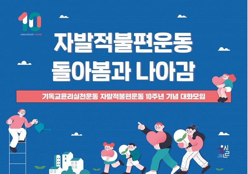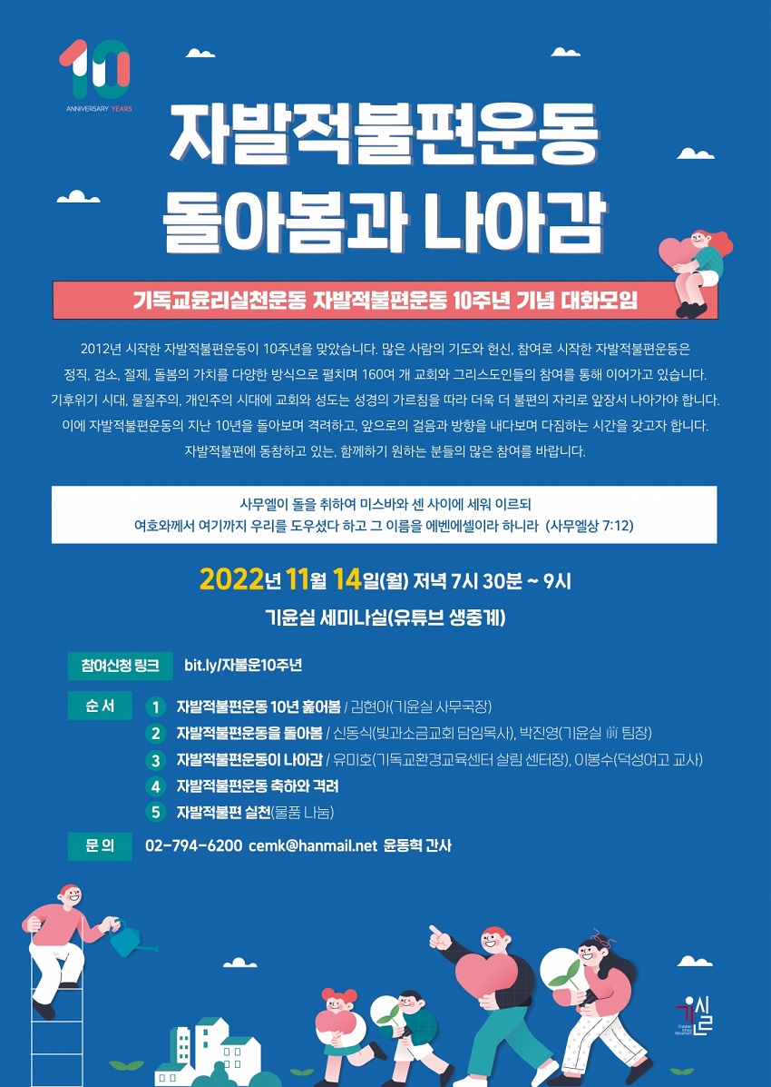 2012년 시작한 자발적불편운동이 10주년을 맞았다. 많은 사람의 기도와 헌신, 참여로 시작한 자발적불편운동은 정직, 검소, 절제, 돌봄의 가치를 다양한 방식으로 펼치며 160여 개 교회와 그리스도인들의 참여를 통해 이어가고 있다. 그리스도인은 기후위기 시대, 물질주의, 개인주의 시대에 교회와 성도는 성경의 가르침을 따라 더욱 더 불편의 자리로 앞장서 나아가야 한다. 이에 자발적불편운동의 지난 10년을 돌아보며 격려하고, 앞으로의 걸음과 방향을 내다보며 다짐하는 시간을 갖는 자리를 마련했다. ‘자발적불편’에 동참하고 있는 그리고 함께하기 원하는 분들은 오프라인과 온라인 동시에 참여할 수 있다.