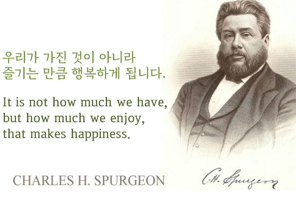 2) 찰스 스펄전-“ 우리가 가진 것이 아니라 즐기는 만큼 행복하게 됩니다.It is not how much we have, but how much we enjoy, that makes happiness.” –Charles Spurgeon-