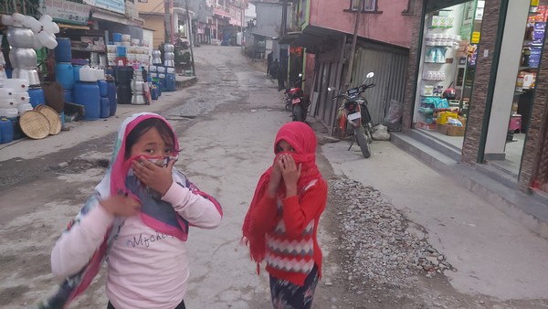 아침 6시에 출발하였는데, 오후4시에 도착하였습니다.카트만두에서 에베레스트산으로 올라가는 중간에 위치한 해발2,000m의 산악도시(우리나라 군)입니다. 숙소앞에 아이들이 놀고 있습니다.