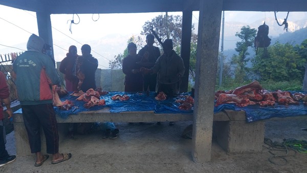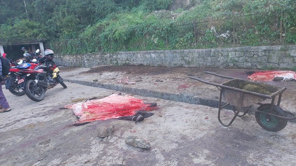 서쪽 비탈면을 따라 내려가다보니 왼쪽편에서 물소고기와 돼지고기 팔고 사는 곳이 나옵니다. 바로 물소를 도축하여 팔고 있습니다.