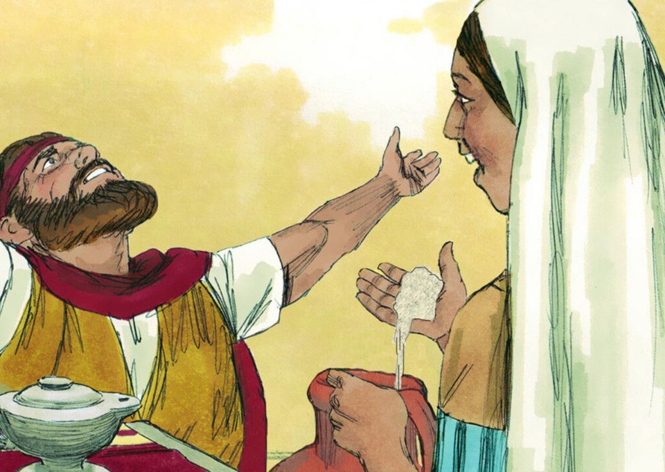 엘리야는 과부에게 재차 말합니다. “그렇게 걱정하지 마시오. 집에 들어가서 방금 말한 대로 음식을 준비하시오. 그리고 음식이 만들어지면 먼저 한 조각을 내게 가져오고 그 후에 아들과 함께 먹도록 하시오! 이스라엘의 하나님 여호와께서 이렇게 말씀하셨습니다. <내가 이 땅에 비를 다시 내릴 때까지 그 통의 밀가루나 병에 그 병의 기름이 떨어지지 아니하리라.>”(왕상17:13-14)