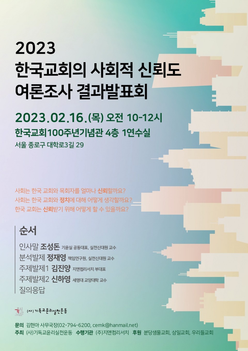 사단법인 기독교윤리실천운동(기윤실)은 2008년, 2009년, 2010년, 2014년, 2017년, 2020년에 이어 3년 만에 “한국 교회의 사회적 신뢰도 여론조사”를 실시하였고, 결과를 분석하여 논의하는 발표회를 개최한다고 밝혔다.