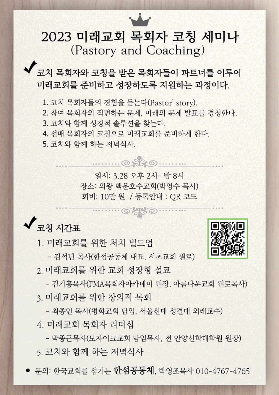 한국교회를 섬기는 패스브레이킹 목회연구소 한섬공동체(대표 김석년 목사)는 2023 미래교회 목회자 코칭 세미나 (Pastory and Coaching)를 연다고 밝혔다. 오는 3월28일(화) 오후2시~밤 8시까지 의왕 백운호수교회(담임 박영수 목사)에서 열리는 이번 세미나는 미래교회를 전망하고 이에 대한 구체적인 코칭 프로그램이 진행될 예정이다.